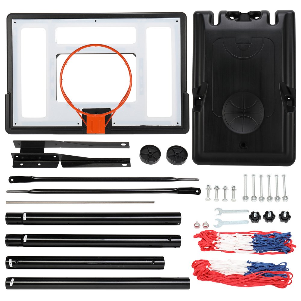 Wanna show off your skills on the court? Then don't miss our Basketball Hoop. As a portable basketball goal system, it offers versatile placement in your backyard or driveway. The height of basketball hoop is adjustable from 7 to 10 feet, while backboard is 35 inch wide for practicing layups and jump shots. Extra large base can be filled with water to improve stability. Two wheels on the bottom enable convenient mobility. Constructed of shatterproof PVC backboard, sturdy steel frame and all-weather nylon net, it is durable for long-lasting use.