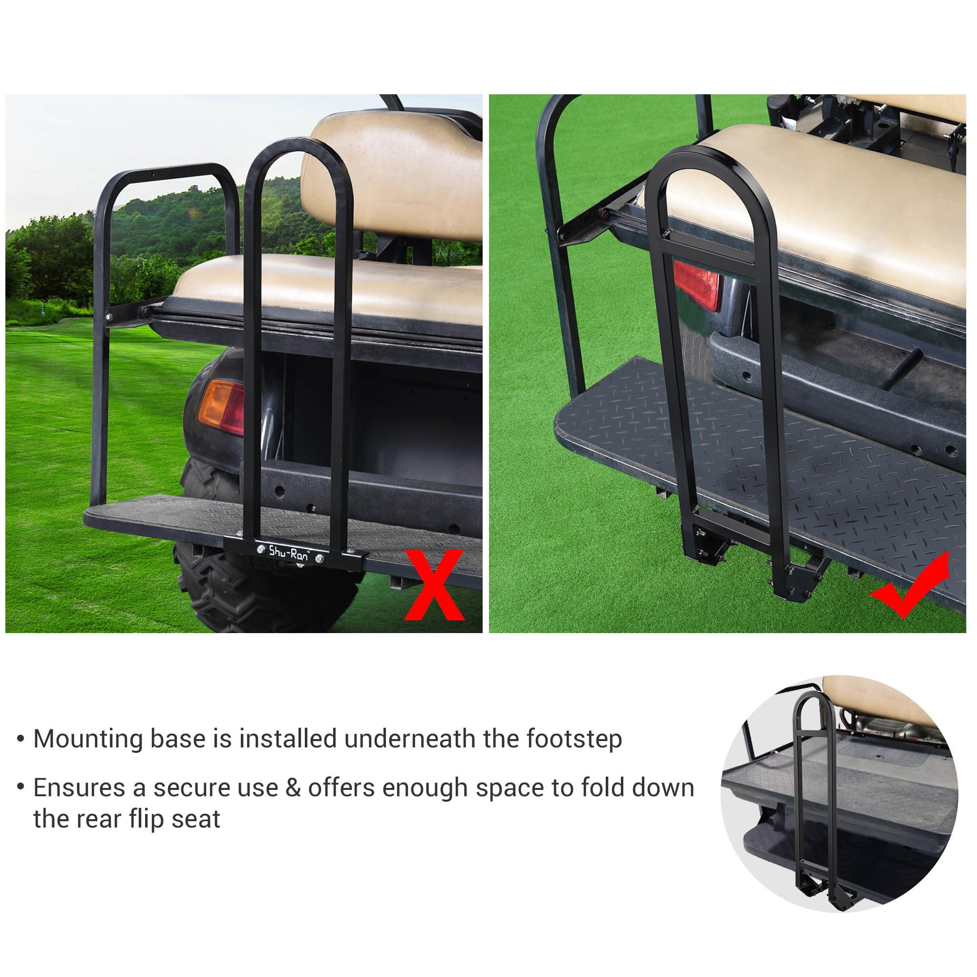 - Safety Grab Bar - Golf Cart Rear Seat Safety Grab Bar is designed to mount on the back footstep of the golf cart, providing aid for getting on or off the golf cart & gives a grab for stability when traveling in bumpy areas; Only fits for TXT of EZGO and Genesis 150 of Madjax