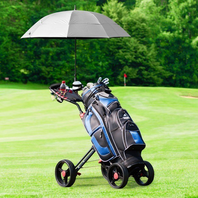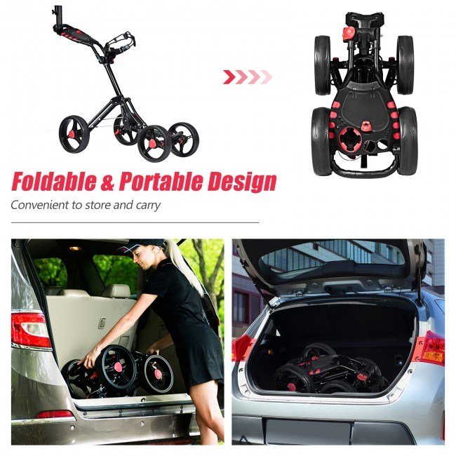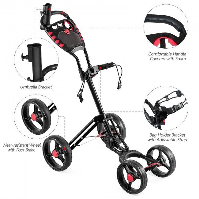 The goplus golf cart is equipped with features that most golfers want, including umbrella holder, scorecard holder and beverage holder on the handle. It has quick folding operation and foot brake.