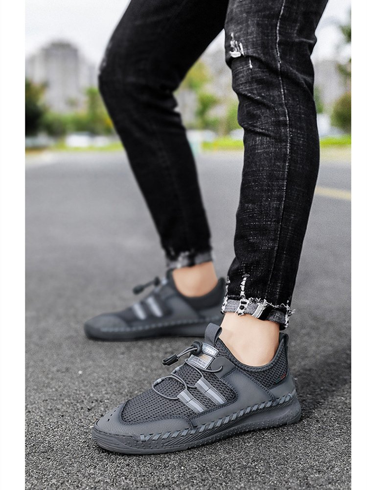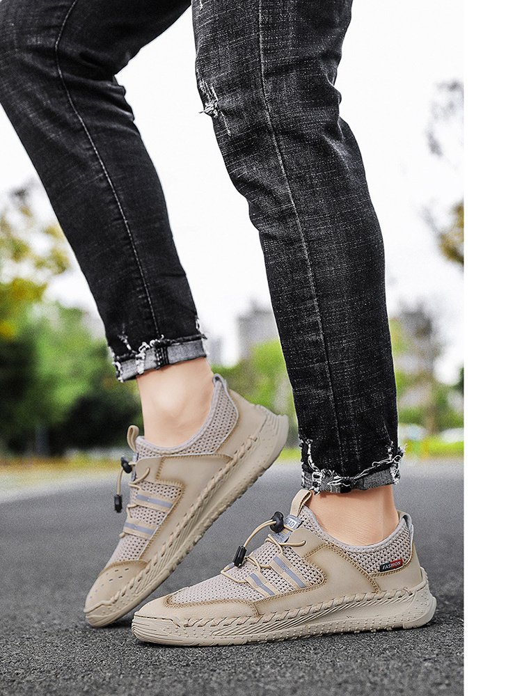 Home > Spring Summer Leather Mesh Casual Shoes Men Slip on Elastic Band Low Top Sneaker Fashion Round Toe Solid High Quality Breathable